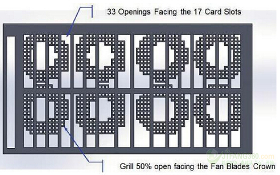 我们创建了一个多孔板,其具有两个主要功能:1)在没有插槽的地方停止气流流动,以避免将空气吹入封闭的EMI屏蔽物;2)在我们观察到较高的气流速度的区域减少气流流动。这个多孔流体分配板(FDP),如图9所示,必须是与该EMI屏蔽接触。其将从而在入口处关闭,由卡机架的另一侧已经关闭了蜂窝孔格封闭。因为板不需要维护,它可以连接到EMI屏蔽代替风扇机架。风扇和该多孔板之间的距离是至关重要的。气流必须能够被通过开口槽而不产生不可接受的压力下降。